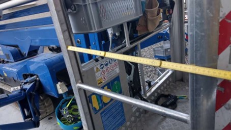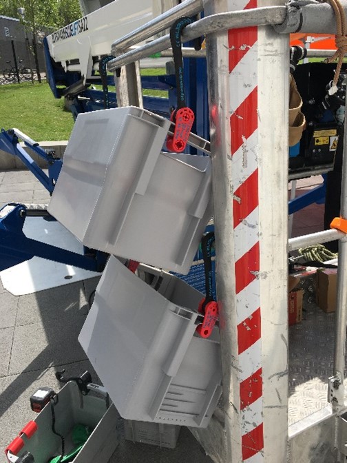 2. Messt den Abstand (das lichte Maß) zwischen den Trägern seitlich an eurem Hubsteiger. So findet ihr raus, ob die Griffekisten zwischen eure Verstrebungen passen. Alternativ müsst ihr nicht messen sondern lediglich versuchen eine Griffekiste dazwischen zu schieben.