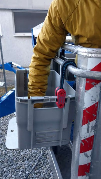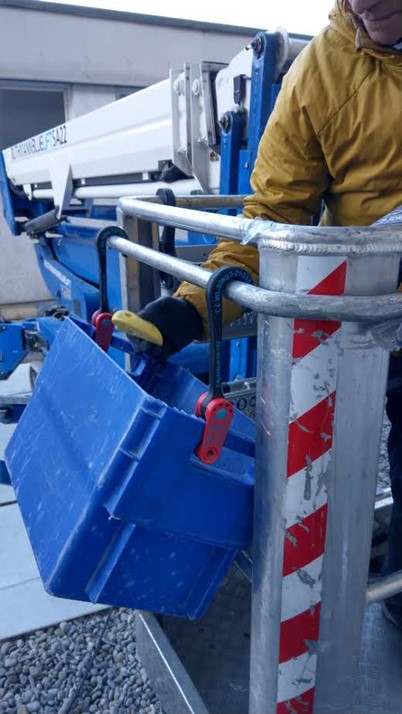 Klappt das oder ist das lichte Maß größer als 48 cm empfehlen wir die langen Haken mit Snap Adapter, da die Griffekisten dann durch den Steigerkorb nach Ihnen neigen können und somit leicht von innen zugänglich sind